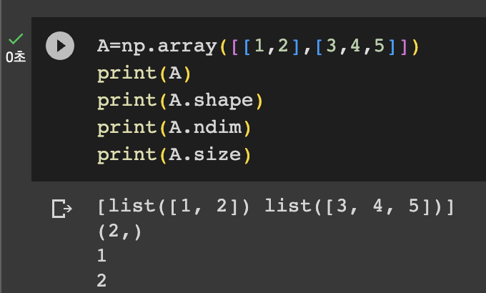 - A.shape: ํ๋ ฌ(ํ ์)์ ํฌ๊ธฐ