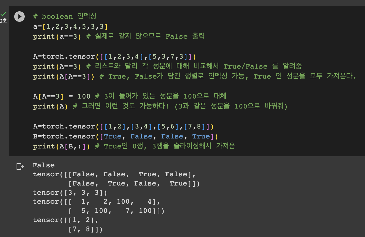 torch์์ boolean ์ธ๋ฑ์ฑ์ ํ์ฉํ๋ฉด ๋์ค์ transformer ๋ง์คํน ๋ฑ์ ํ ๋ ๋งค์ฐ ์ ์ฉํ๊ฒ ์ฐ์ผ ์ ์๋ค๊ณ ํ๋ค.