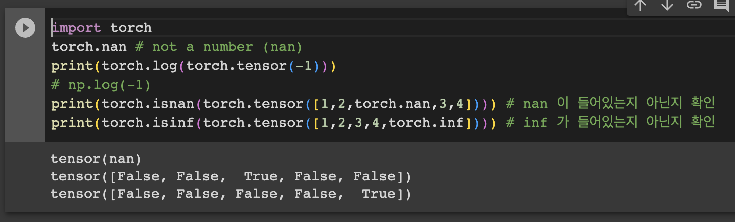 torch.nan ์ ์ซ์๊ฐ ์๋ ๊ฐ์ด๊ณ , torch.inf ๋ Infinite ํ ๊ฐ์ด๋ค.
