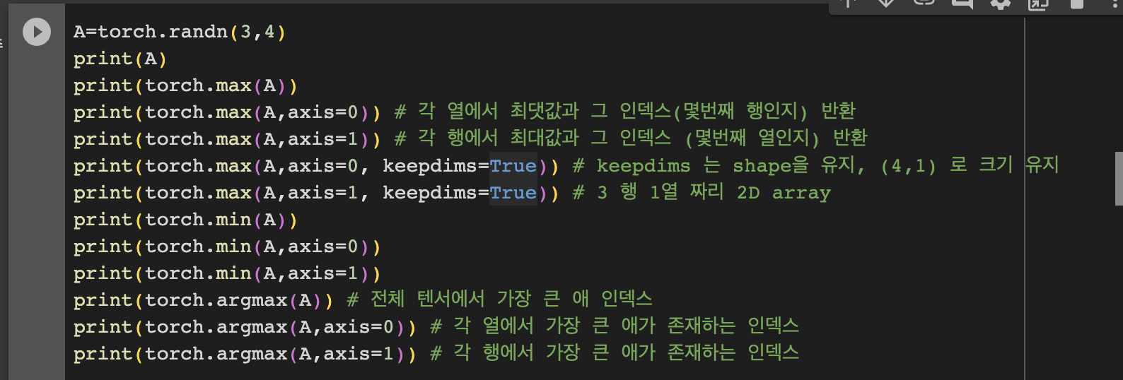 - torch.max(A,axis=1, keepdims=True): ์ฐจ์๊ณผ ํ ์ฌ์ด์ฆ(3)๋ฅผ ์ ์งํ๋ฉด์ ์ต๋๊ฐ ๋ฐํ, shape: (3,1)