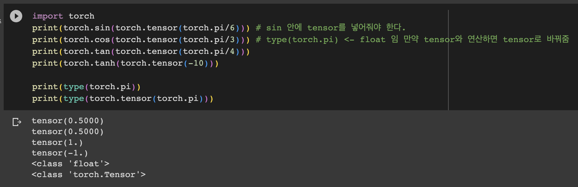 - torch.pi ์ type ์ float ์ด๋ค. ๊ทธ๋ฐ๋ฐ torch.tensor๋ก ๊ฐ์ธ์ฃผ๋ฉด type์ด tensor ๋ก ๋ฐ๋๋ค.