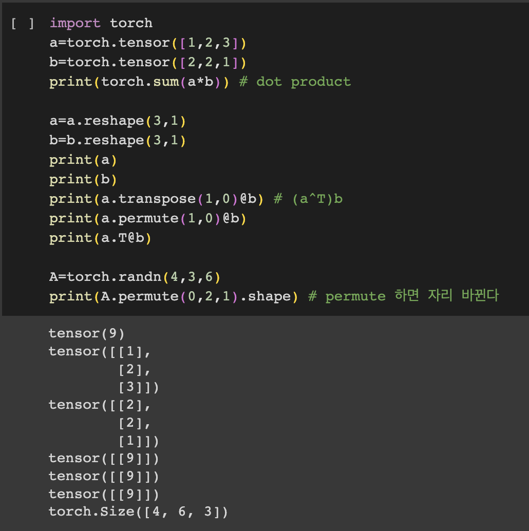 - torch.sum(a*b): ํ๋ ฌ์ ๋ด์ , ์์๋ผ๋ฆฌ์ ๊ณฑ์ ๋ํ๊ธฐ