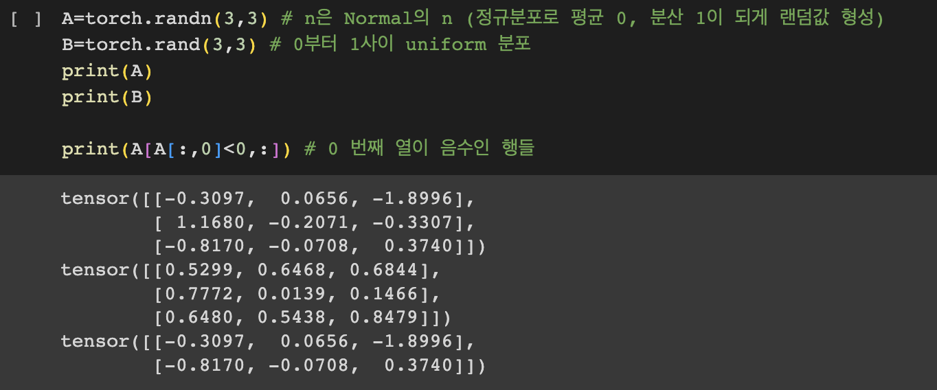 2. torch.rand: 0๋ถํฐ 1์ฌ์ด ๋๋คํ ์ซ์๋ค์ uniform distribution ์ผ๋ก ๋ฐํ