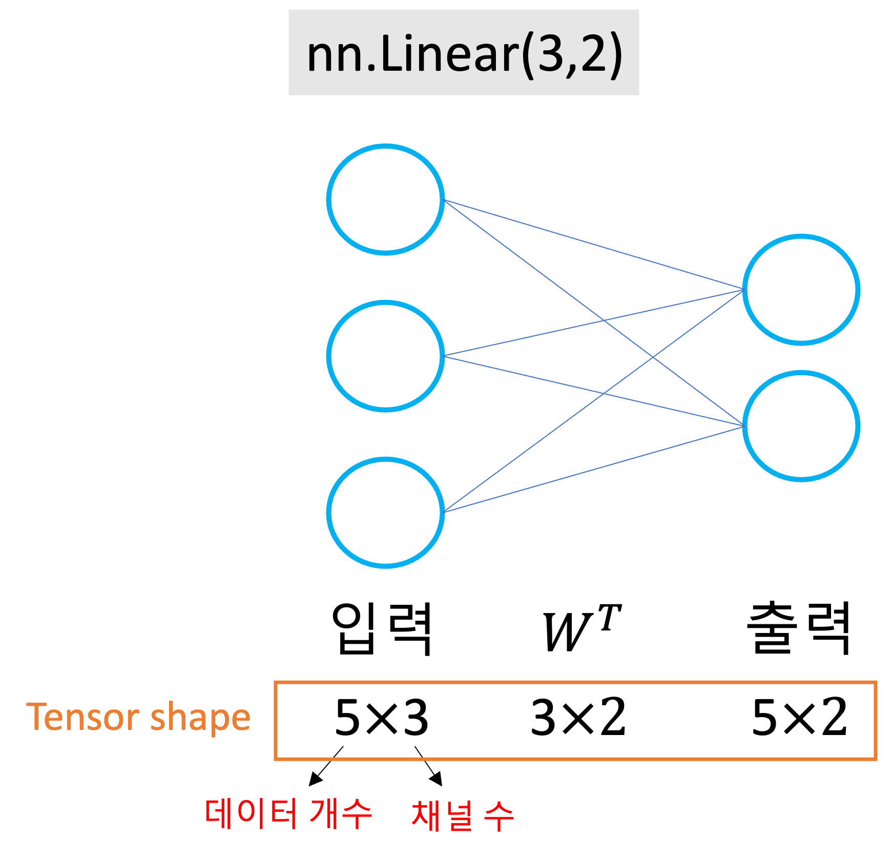 nn.Linear(3,2) ์์ ๋ฐ์ดํฐ ๊ฐ์๋ ์ผ๋ง๋ ์ง ๋ฐ๋ ์ ์์ง๋ง (์ํ๋ ๋ฐ์ดํฐ ๊ฐ์ ๋งํผ)
