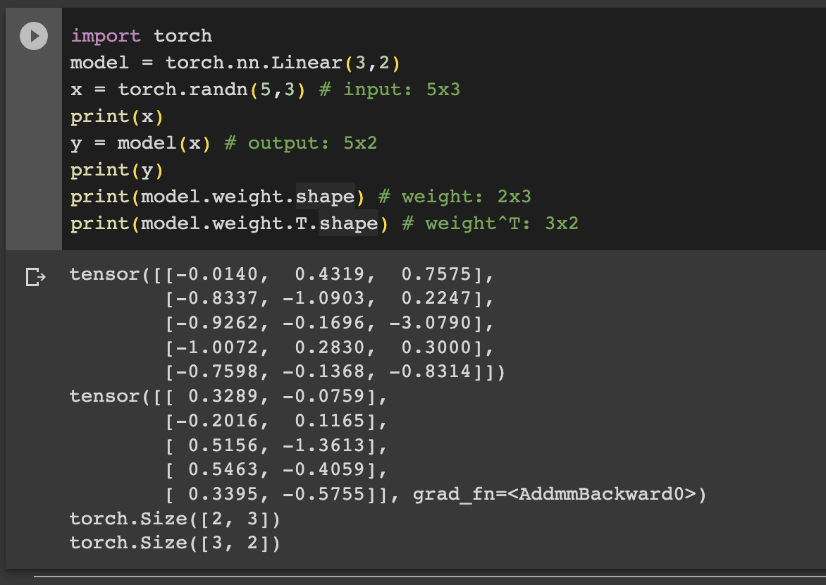 - nn.Linear(3,2): ์ ๋ ฅ ๋ ธ๋ 3๊ฐ, ์ถ๋ ฅ ๋ ธ๋ 2๊ฐ์ธ ๋ ์ด์ด๋ฅผ ๊ฐ์ง ๋ชจ๋ธ