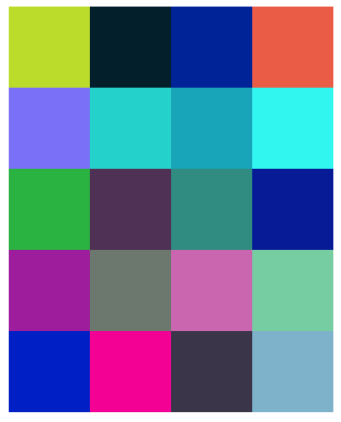 import numpy as np import matplotlib.pyplot as plt # ๊ฐ์์ ์ด๋ฏธ์ง ๋ฐ์ดํฐ ์์ฑ (๋์ด: 4, ๋๋น: 4, ์ฑ๋: 3) a = 5 b = 4 c = 3 image_data = np.random.randint(0, 256, (a, b, c), dtype=np.uint8) print(image_data.shape) # Matplotlib๋ฅผ ์ฌ์ฉํ์ฌ ์ด๋ฏธ์ง ํ์ plt.imshow(image_data) plt.axis('off') # ์ถ ์ ๊ฑฐ plt.show()