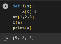 ๋‘๋ฒˆ์งธ ์ฝ”๋“œ์—์„œ๋Š” ํ•จ์ˆ˜๋ฅผ ํ˜ธ์ถœํ•  ๋•Œ list๋ฅผ ์ธ์ˆ˜๋กœ ์ „๋‹ฌ๋ฐ›๊ธฐ ๋•Œ๋ฌธ์— call by reference๋กœ ์ „๋‹ฌ๋ฐ›์€ ๊ฐ์ฒด๋ฅผ ์ง์ ‘ ๋ณ€๊ฒฝํ•œ๋‹ค.