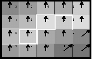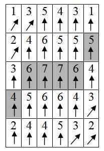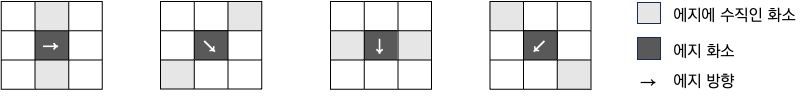 ์์ 1) edge strength๊ฐ ๊ฐ ํ์์ ์ซ์๋ก ์ฐ์ฌ์๋ค. ๊ทธ๋๋์ธํธ ๋ฐฉํฅ์ ํ์ดํ๋ก ๋ํ๋์์ผ๋ฉฐ ๊ฐ ๋ฐฉํฅ์ ์์ง์ธ ์ด์ํ์์ edge strength๋ฅผ ๋น๊ตํ๋ค. NMS๋ฅผ ์งํํ ๊ฒฐ๊ณผ๋ ํฐ์ ๊ฒฝ๊ณ์ ์ผ๋ก ๋ฌถ์ฌ์ ธ ์๋ค.