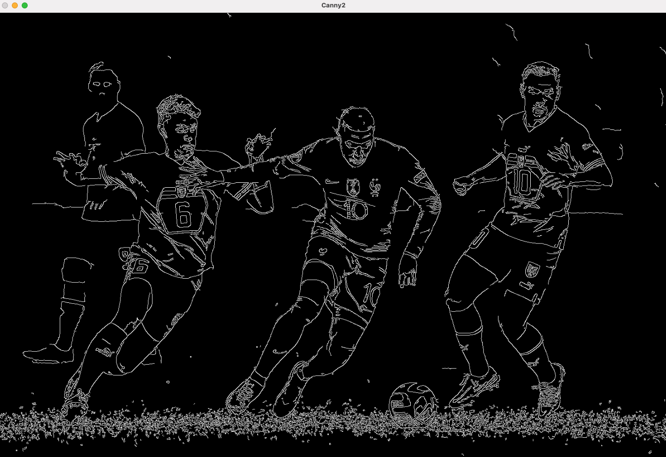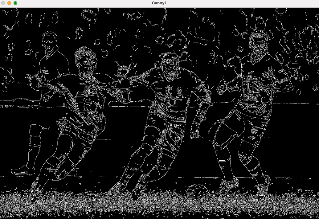 import cv2 as cv img = cv.imread('soccer.jpg') gray = cv.cvtColor(img, cv.COLOR_BGR2GRAY) canny1 = cv.Canny(gray, 50, 100) canny2 = cv.Canny(gray, 100, 200) cv.imshow('Original', gray) cv.imshow('Canny1', canny1) cv.imshow('Canny2', canny2) cv.waitKey() cv.destroyAllWindows()