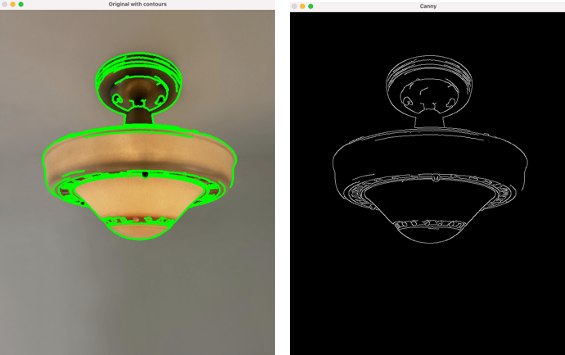 import cv2 as cv import numpy as np img = cv.imread('light.jpg') gray = cv.cvtColor(img, cv.COLOR_BGR2GRAY) canny = cv.Canny(gray, 30,100) contour, hierarchy = cv.findContours(canny, cv.RETR_LIST, cv.CHAIN_APPROX_NONE) lcontour = [] for i in range(len(contour)): if contour[i].shape[0] > 100: lcontour.append(contour[i]) cv.drawContours(img, lcontour, -1, (0, 255, 0), 3) cv.imshow('Original with contours', img) cv.imshow('Canny', canny) cv.waitKey() cv.destroyAllWindows()