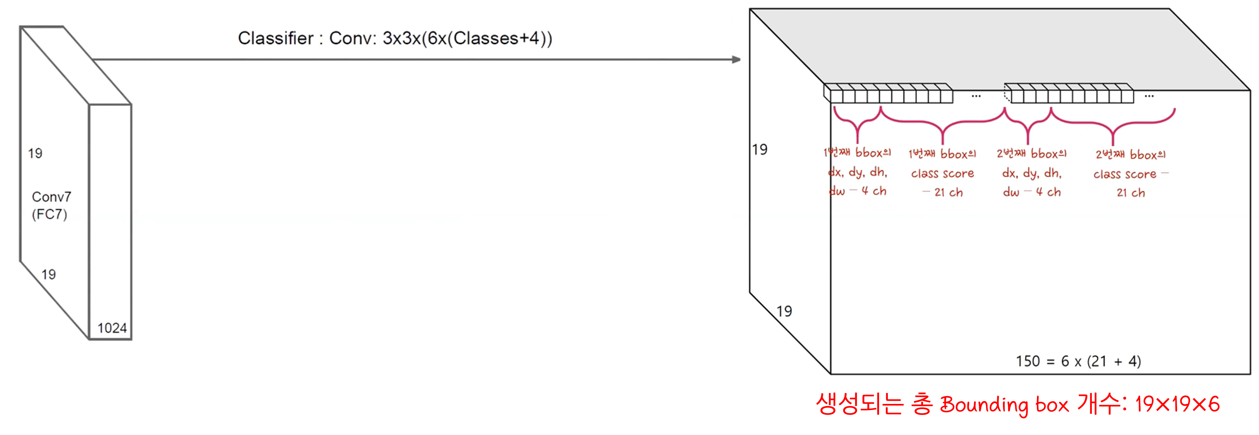 19x19x1024 feature map ์ผ๋ก๋ถํฐ 19x19x6(=2166) ๊ฐ์ default box๊ฐ ์๊ธธ ๊ฒ์ด๋ค.