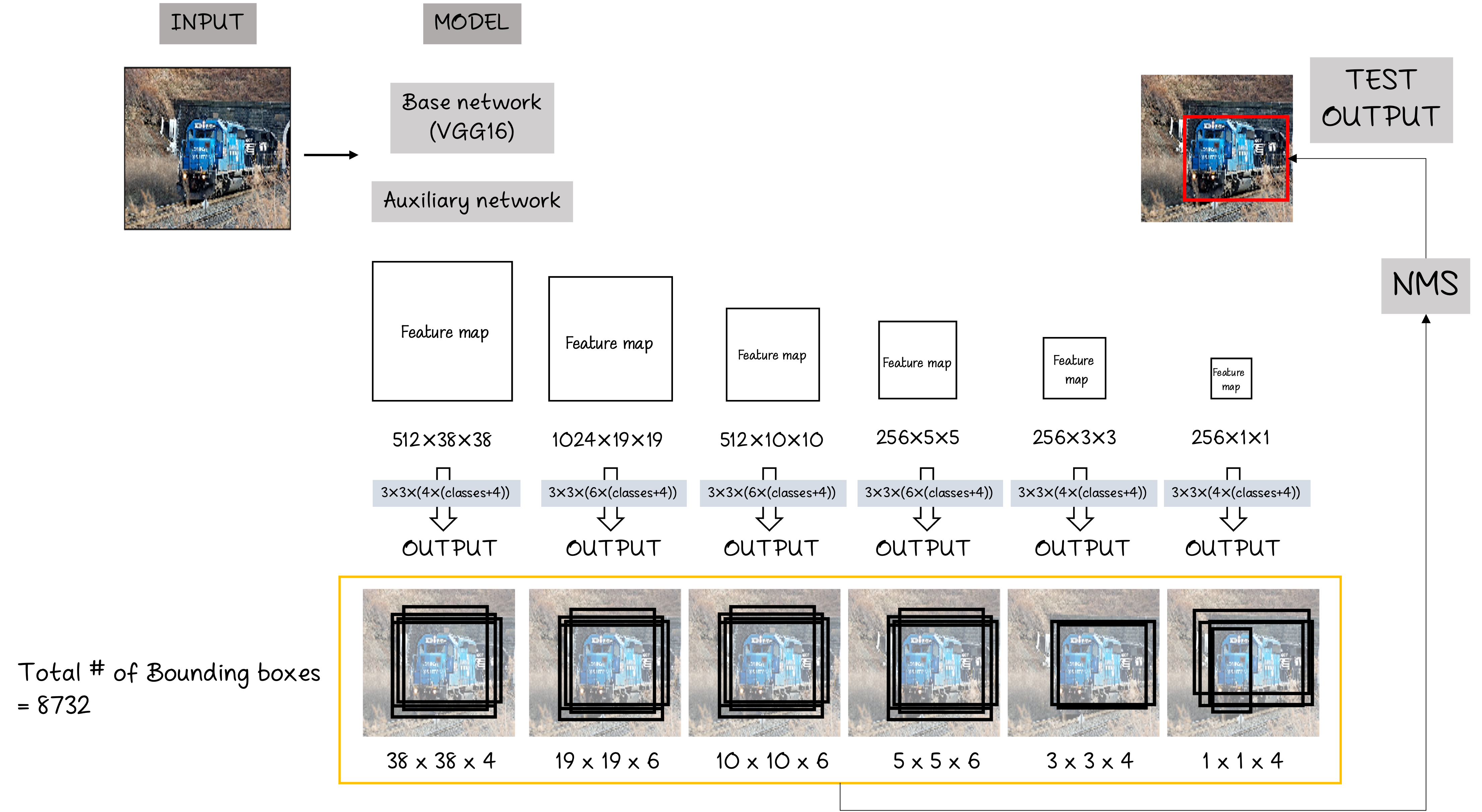 ๋ฐ๋ผ์ 38x38, 19x19, 10x10, 5x5, 3x3, 1x1 ์ด 6๊ฐ์ feature map ๊ฐ๊ฐ์์ ์์ธก๋ ๋ฐ์ด๋ฉ๋ฐ์ค์ ์ด ํฉ์ 8732๊ฐ ๋๋ ๊ฒ์ด๋ค.