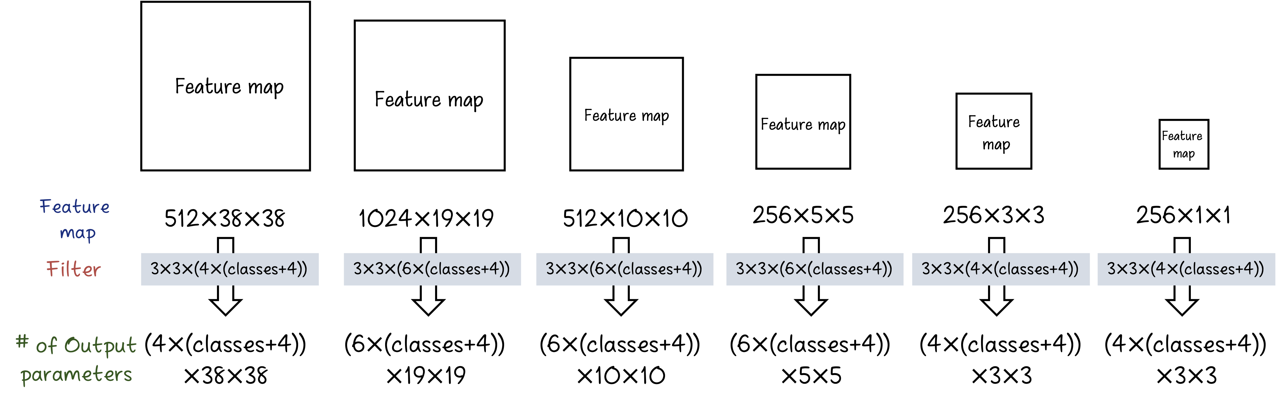 BBox ๋ฅผ ์์ฑํ๋ Feature map ์ 6๊ฐ๊ฐ ์๋๋ฐ, 38x38, 19x19, 10x10, 5x5, 3x3, 1x1 ์ด ์๋ค.