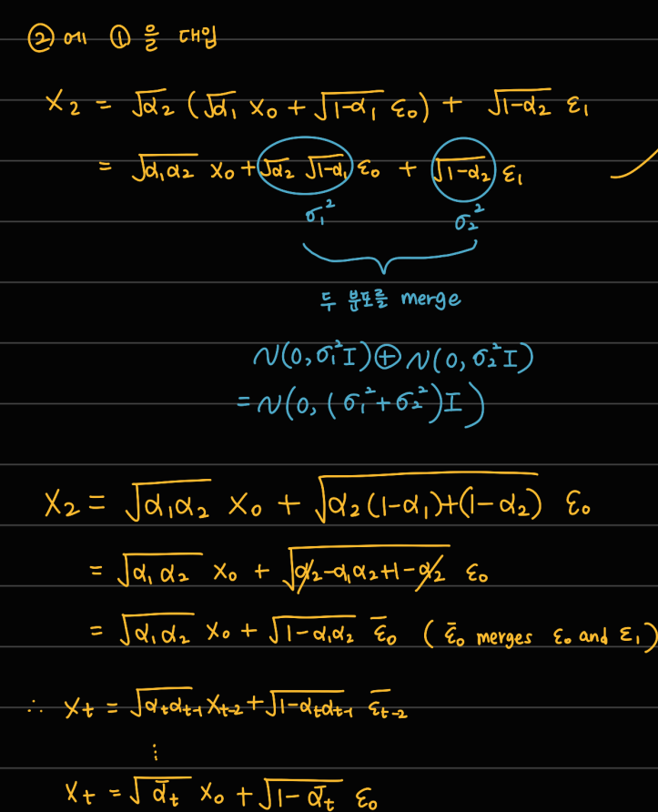 ์์ forward process ์์ t=0, 1, 2, ... ๋ฅผ ๋์ ํด๋ณด๋ฉด ์๋์ ๊ฐ์ ์๋ค์ ์ป์ ์ ์๋ค.