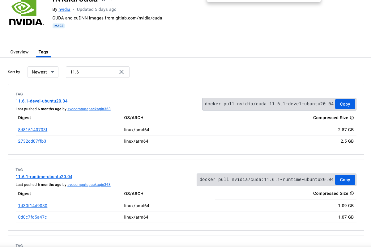 ๋๋ Cuda 11.1์ด ํ์ํ๊ธฐ ๋๋ฌธ์ ์ด์ ํด๋นํ๋ ์ด๋ฏธ์ง๋ฅผ ๋ค์ด๋ฐ์๋ค. Tags ํญ์์ ์ํ๋ cuda ๋ฒ์ ์ ๊ฒ์ํ๋ฉด ์ฌ๋ฌ ์ด๋ฏธ์ง๋ค์ด ๋์ค๋๋ฐ, ๋๋ 11.6.1-cudnn8-runtime-ubuntu20.04 ์ด๋ฆ์ ํ๊ทธ๋ฅผ ๋ค์ด๋ฐ์๋ค.
